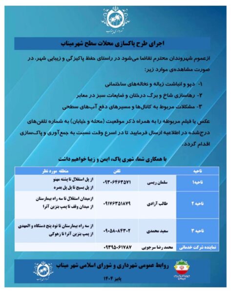 بنا بر اعلام روابط عمومی شهرداری میناب، این نهاد با هدف بهبود وضعیت بهداشت محیط و زیباسازی شهر، طرح پاکسازی محلات را در نقاط مختلف آغاز کرده است.