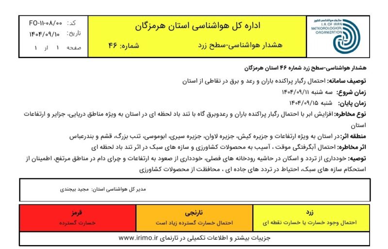 مهرداد حسنزاده، مدیرکل مدیریت بحران استانداری هرمزگان با اشاره به اینکه این شرایط جوی از روز سهشنبه ۱۱ آذر تا شنبه ۱۵ آذرماه ۱۴۰۴ ادامه خواهد داشت، از شهروندان خواست با رعایت توصیههای ایمنی، از تردد و اسکان در حاشیه رودخانههای فصلی خودداری کرده و از صعود به ارتفاعات و چرای دام در مناطق مرتفع پرهیز کنند.