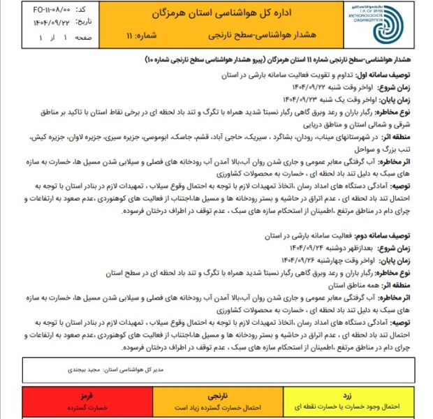 سیسیپور با تأکید بر حساس بودن شرایط جوی استان تصریح کرد: از هفته جاری تا اوایل هفته آینده و تا روز شنبه، استان هرمزگان بهطور متناوب تحت تأثیر سامانههای بارشی قرار خواهد داشت.