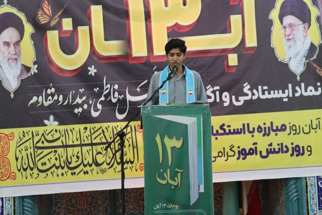 مراسم بزرگداشت ۱۳ آبان، روز ملی مبارزه با استکبار جهانی، امروز با حضور جمعی از مردم ، مسئولان و دانش آموزان در مسجد حضرت امام خمینی (ره) شهر میناب برگزار شد.